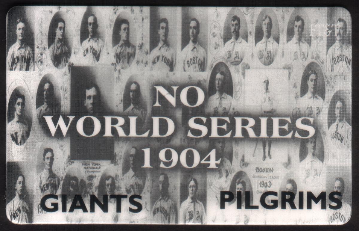 This collectible phone card features a black and white image related to Baseball, prominently depicting the 1904 World Series context. It specifically shows the New York Giants and Boston Pilgrims, also known as the Boston Red Sox or Boston Red Stockings, a team from Boston, Massachusetts. The card includes the official World Series logos along with Major League Baseball (MLB) trademarks.