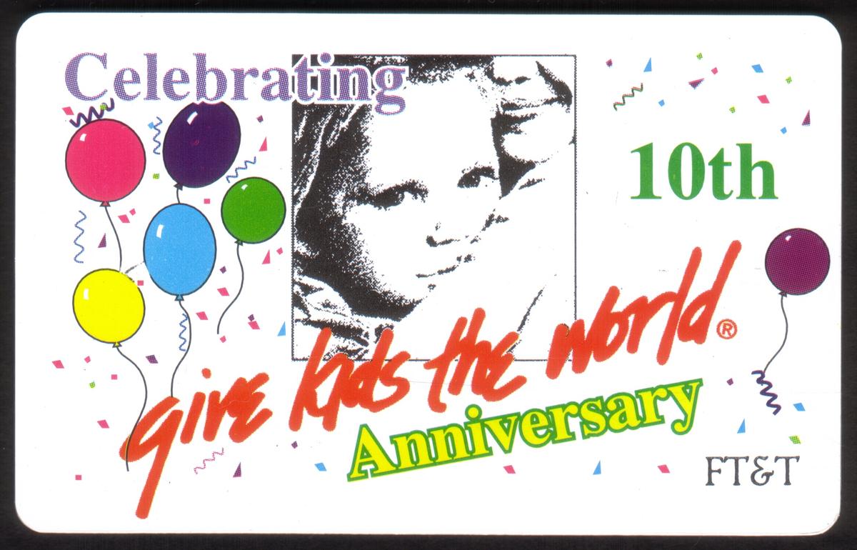 This collectible promotional phone card commemorates the 10th anniversary of Give Kids The World, a nonprofit organization. The design prominently features the “10u” logo alongside the text “Give Kids The World,” clearly marking the milestone event. The card also includes the names Gary A. Pierce and Gary A. Pierce again, indicating involvement or recognition, as well as the company names HT Technologies and H.T. Technologies. Additional text reads “FT&T Florida Telecard,” linking the card to Florida Telecommunications.