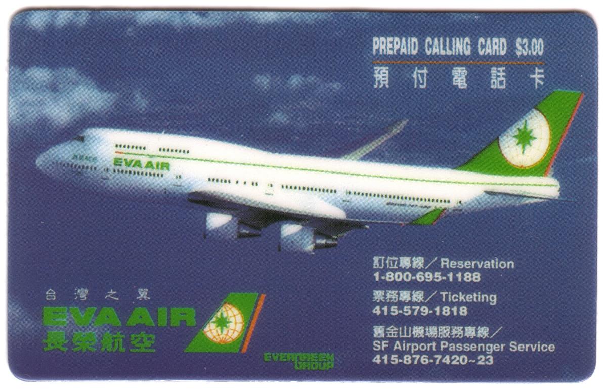 The overall color scheme features sky blue and green tones, complementing the Eva Air brand colors. The card combines airline imagery with corporate logos and telecommunication references, making it a collectible item related to both aviation and phone service industries.
