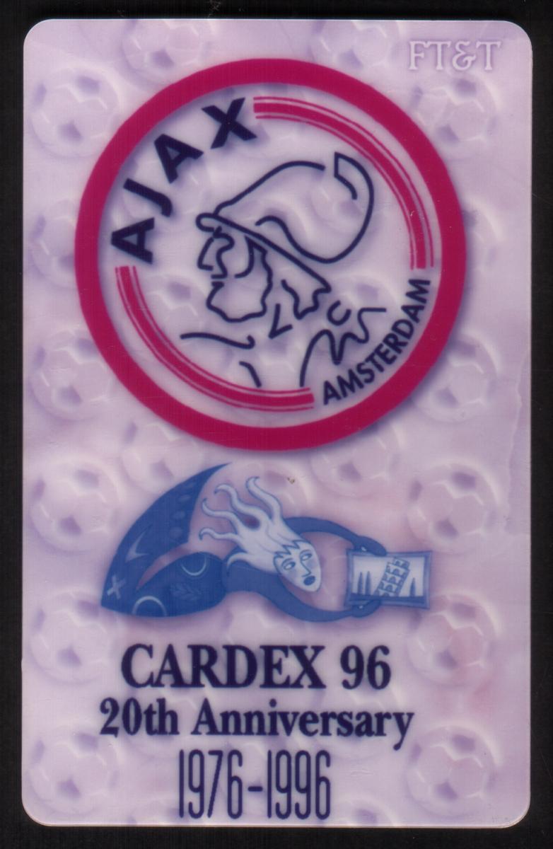 This collectible phone card commemorates the 20th Anniversary of CardEx '96, dated 1976-1996. It features the emblem of Ajax Amsterdam prominently at the top. The Ajax logo is encircled by a red ring and displays a stylized profile of a figure wearing a helmet, consistent with the historic imagery associated with the Ajax football club.