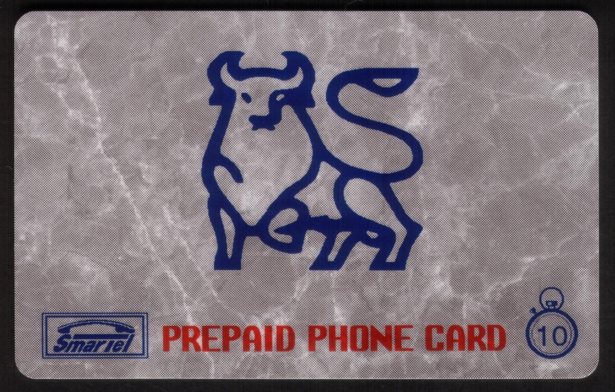 The overall design is minimalistic yet corporate, aligning with keywords relating to finance, investment firms, and financial services through the bull imagery and professional color scheme. The card's details confirm it is a prepaid phone card issued by SmarTel with a value of 10 units.