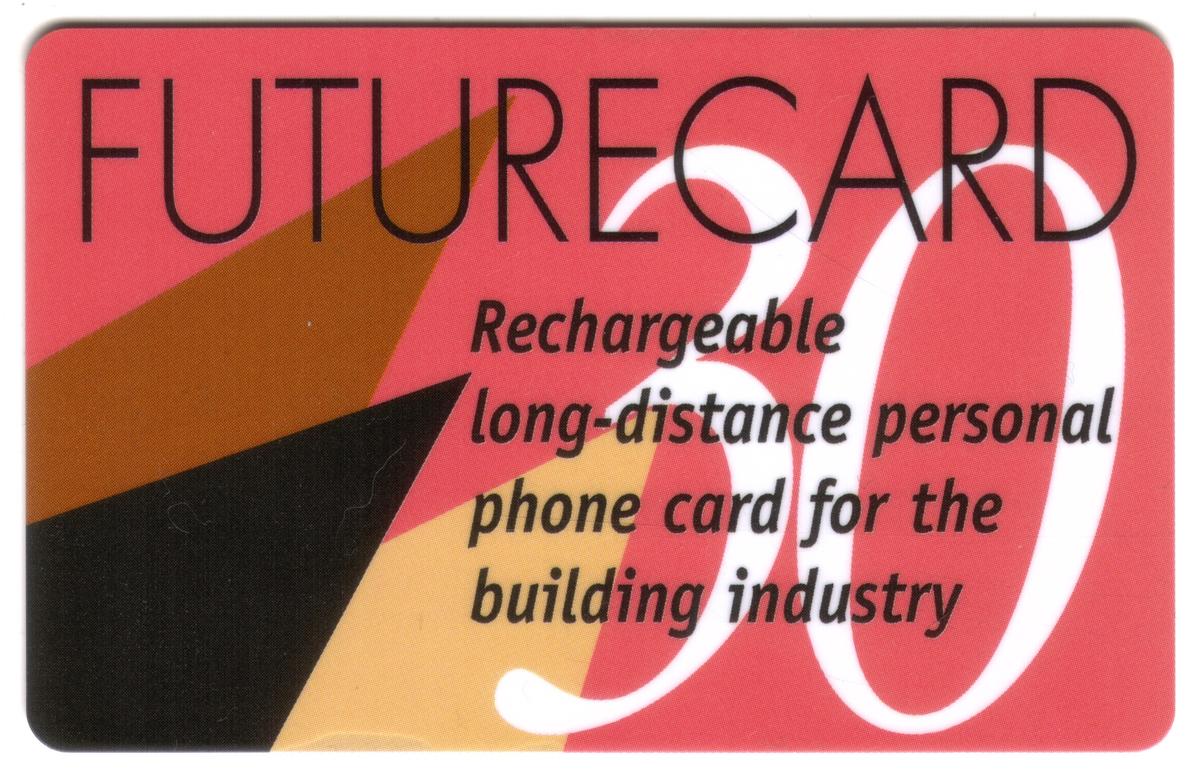 This collectible phone card features a predominantly white background with the FutureCard 30 logo prominently displayed near the top left corner. The card includes the text "personal phone card for the building industry" indicating its intended use within that sector. The name "Global Commun. Net." appears on the card, identifying the network or issuing entity associated with the card.
