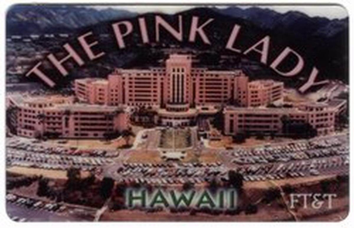 This collectible phone card features the Department of the Army Tripler Medical Center located in Honolulu, Hawaii. The image prominently displays the distinctive architecture of the Tripler Army Medical Center, also known as the Pink Lady Complex, set against a clear sky. The large, pinkish building with its unique design is captured from a slightly elevated angle, highlighting its sprawling structure and the surrounding lush greenery.