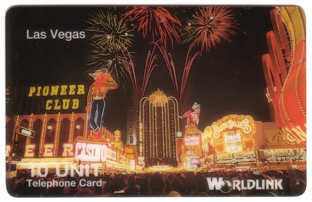 The design incorporates vivid colors and sharp details, including signage and architectural elements, making it a rich representation of Las Vegas’s famous gambling district. The WorldLink Communications logo appears on the card, indicating the issuing company. This card serves as a collectible tribute to the vibrant casino culture of Fremont Street and the Las Vegas Strip.