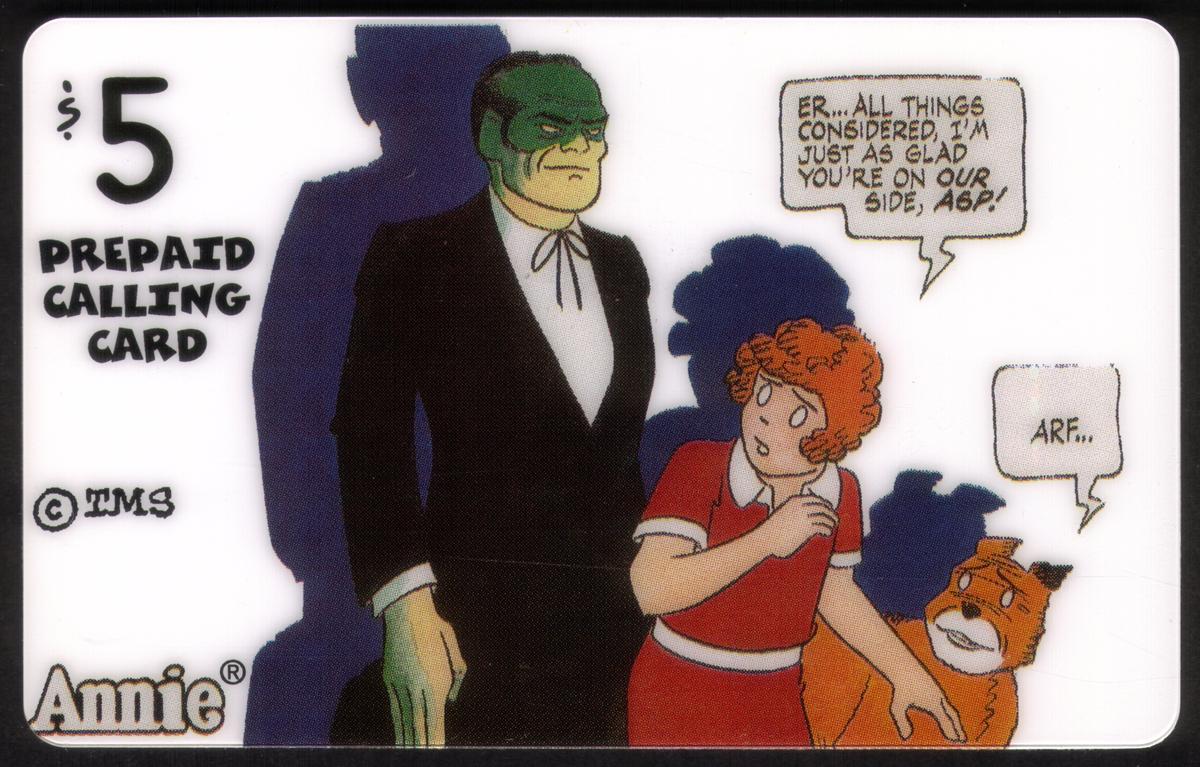 $5 prepaid calling card featuring Little Orphan Annie characters Annie, Sandy, and The Asp in a nostalgic comic strip style, highlighting friendship and adventure. |