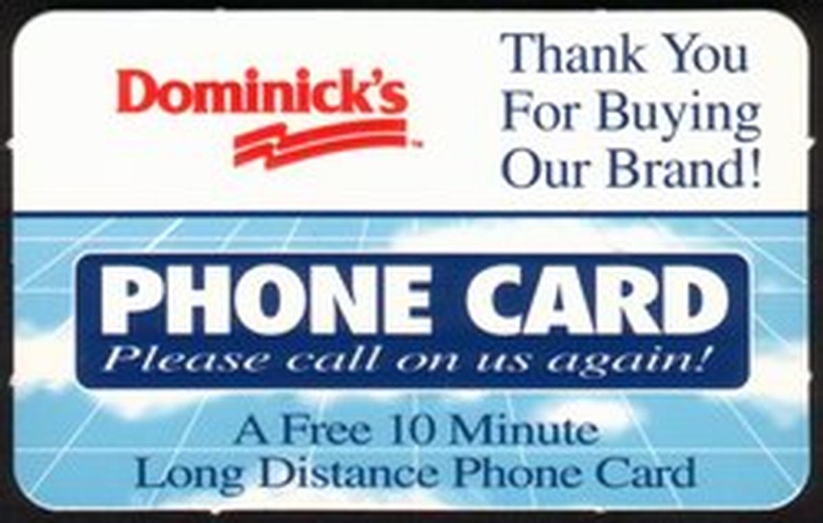 The card also features the logo and name of Innovative Telecom, the telecommunications company associated with the issuance of this phone card. The overall design uses clear, professional typography focused on the retail and pharmaceutical theme, emphasizing Dominick’s position as a drug retailer and pharmacy chain.