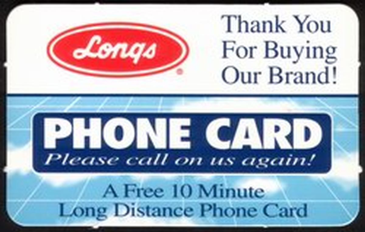 This collectible phone card features branding associated with Long's Drugs, a well-known chain of drug stores and pharmacies. The card prominently presents the Long’s 10m logo alongside Perrigo Generic Pain Reliever Promo, indicating a promotional theme centered on pharmaceuticals and healthcare products. The design includes the phrase “Longs Brand Drugs” emphasizing the retailer’s identity, as well as an association with Perrigo, a company recognized for generic pharmaceutical products.