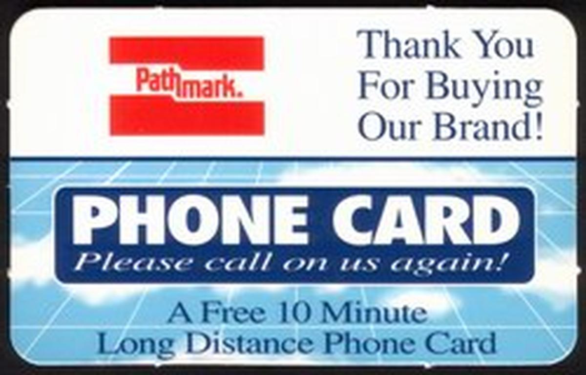 This collectible phone card features branding and promotional information related to PathMark Brand Drugs and Perrigo Generic Pain Reliever. The design includes the text "drug stores, pharmacies, pharmaceuticals, pharmacy, drugs, prescriptions, drug retailer, chain stores," clearly highlighting the pharmaceutical retail theme. The card also displays the mention of "Perrigo Generic Pain Reliever Promo," indicating a specific promotional focus on generic pain relief medication. The name "PathMark" is prominently shown, identifying the card’s connection to that retail chain.