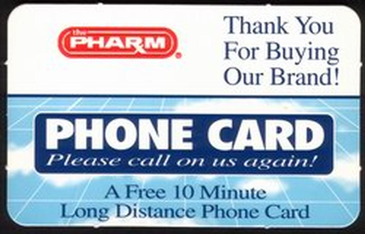 This collectible phone card features branding related to pharmaceutical drug retailing. The front side prominently displays the logo and name "The Pharm Brand Drugs" alongside text that reads "Perrigo Generic Pain Reliever Promo." The card highlights a chain of drug stores and pharmacies, emphasizing pharmaceuticals, pharmacy services, prescriptions, and drug retailing. The imagery and text reinforce the association with a drug retailer, targeting customers interested in drug-related products and prescriptions.