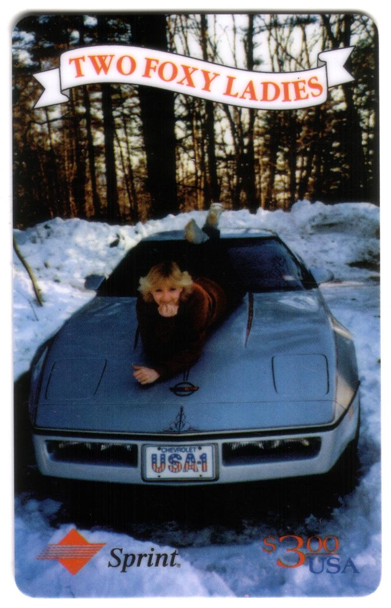This collectible phone card, titled "Two Foxy Ladies," is part of a General Motors Chevrolet promotion. It features a woman lying on the hood of a silver Chevrolet Corvette with a USA-1 license plate. The scene takes place outdoors amid snow-covered ground and tall pine trees in the background, suggesting a winter setting. The woman is resting on her stomach with her chin propped on her hands, looking directly at the camera.