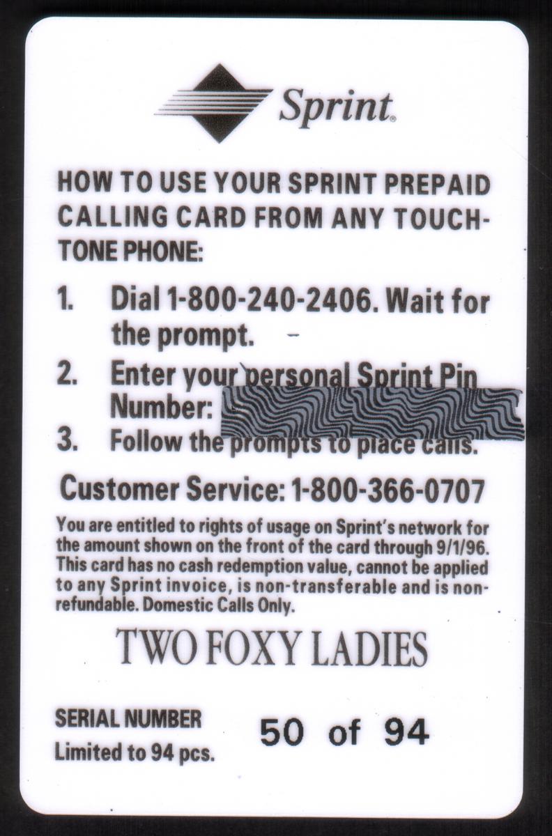 The phone card has the title "TWO FOXY LADIES" displayed prominently at the top within a white ribbon banner outlined in red. At the bottom left, the Sprint logo appears in orange and black. The card’s value is marked as $3.00 in orange text on the lower right, accompanied by "USA" beneath the dollar amount.