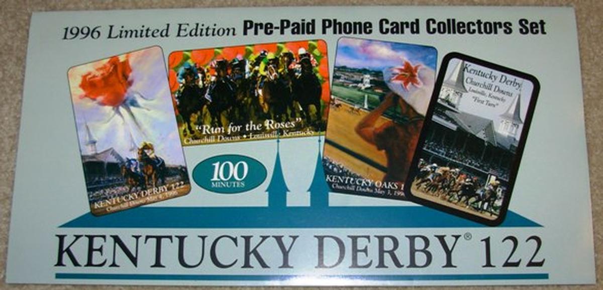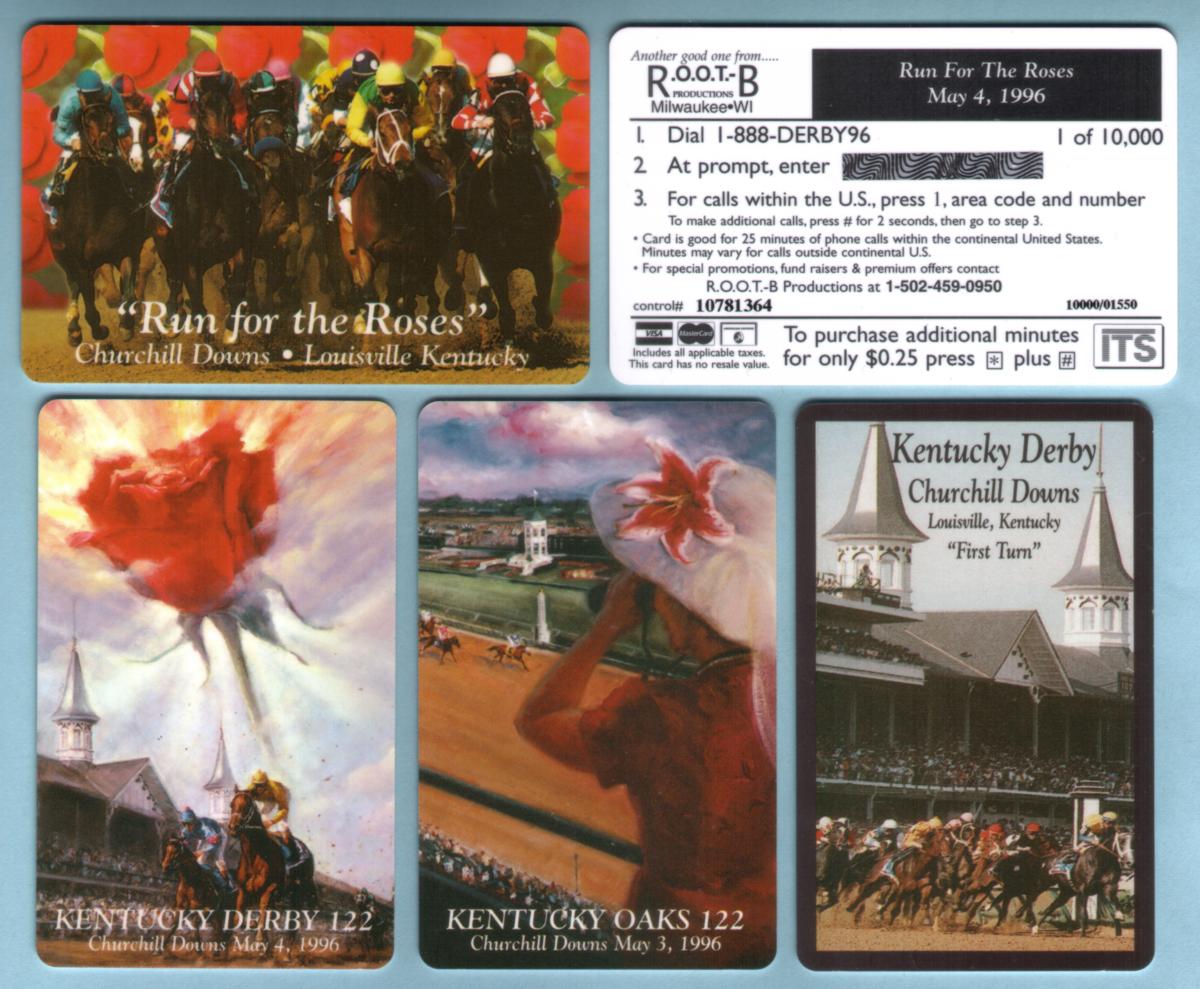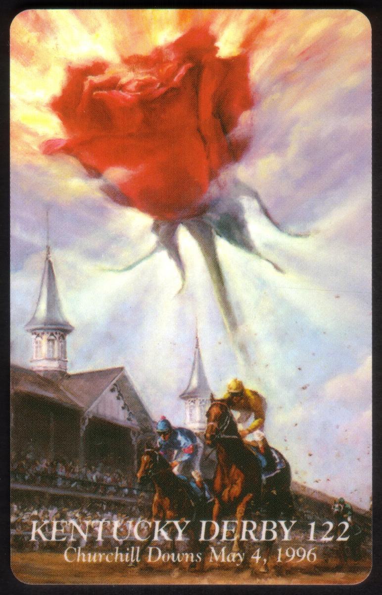 The third card highlights the 122nd Kentucky Derby held on May 4, 1996. The artwork features two racehorses with jockeys in the foreground, mounted and mid-race, against a dynamic sky with a giant red rose dominating the upper section of the card, symbolizing the race’s nickname and floral significance.