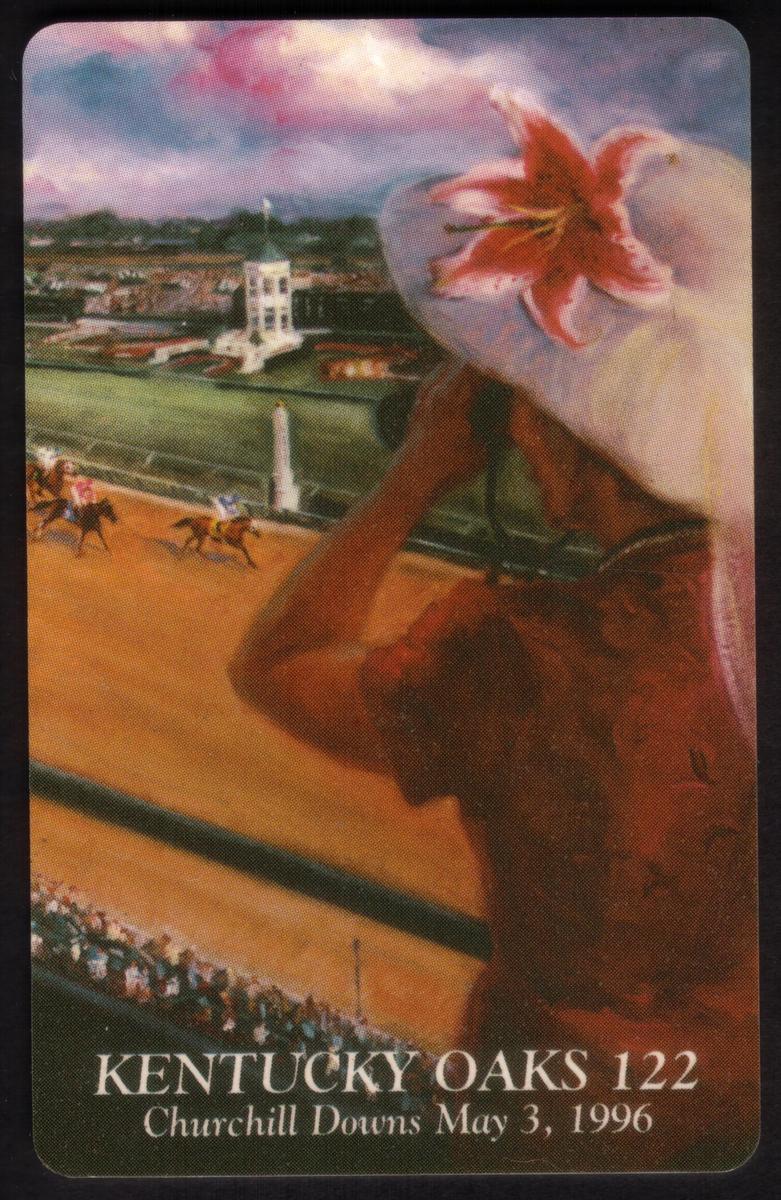 The fourth card commemorates the Kentucky Oaks race held on May 3, 1996, also the 122nd edition. The artistic illustration focuses on a woman in a large hat decorated with a pink lily, watching the race through binoculars. The Churchill Downs race track and crowd are visible in the distance, celebrating the tradition and pageantry unique to the Kentucky Oaks event.