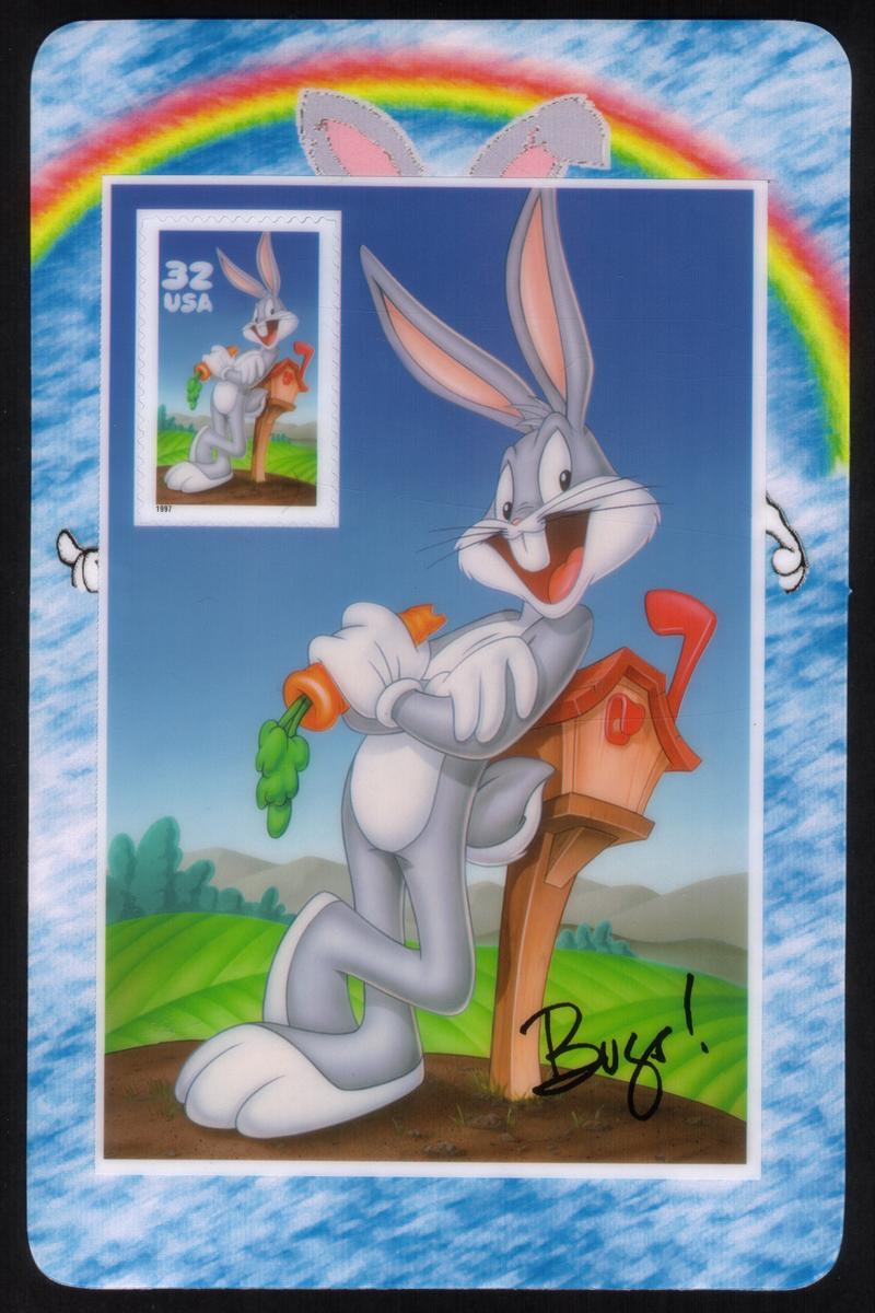 At the top of the card, there is clear text stating “10m Bugs Bunny With A Carrot Postage Stamp,” indicating that the image is inspired by a postage stamp design. The card also includes words such as “i’ve been framed,” referencing a comic or cartoon theme. The layout and color scheme are vibrant, emphasizing a joyful and animated atmosphere, consistent with the comedic and lighthearted style typical of Bugs Bunny cartoons and comic strips.