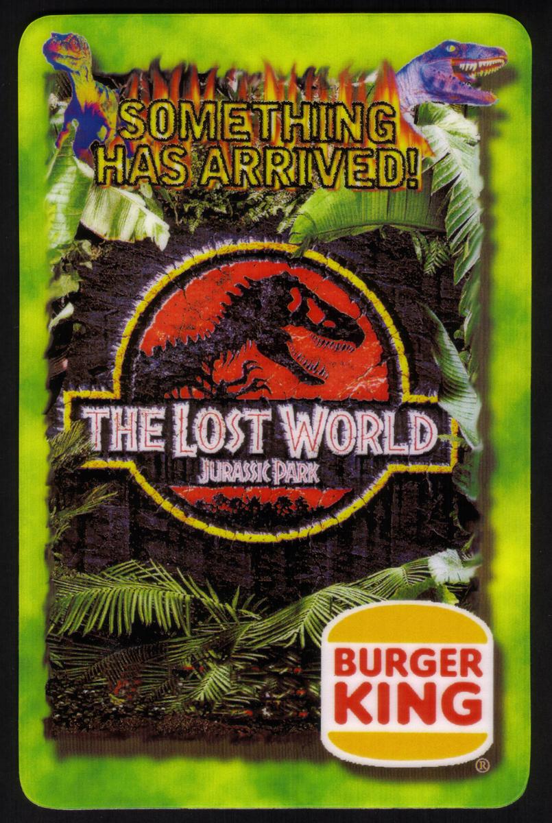 Positioned alongside the dinosaur is the Burger King brand logo, confirming the collaboration between the fast-food chain and the film. The card's surface includes additional text such as "JUMBO" and "Tell-One Inc.," indicating the company responsible for the card's production. The theme suggests entertainment and movie-related memorabilia, specifically targeting fans of *The Lost World: Jurassic Park*.