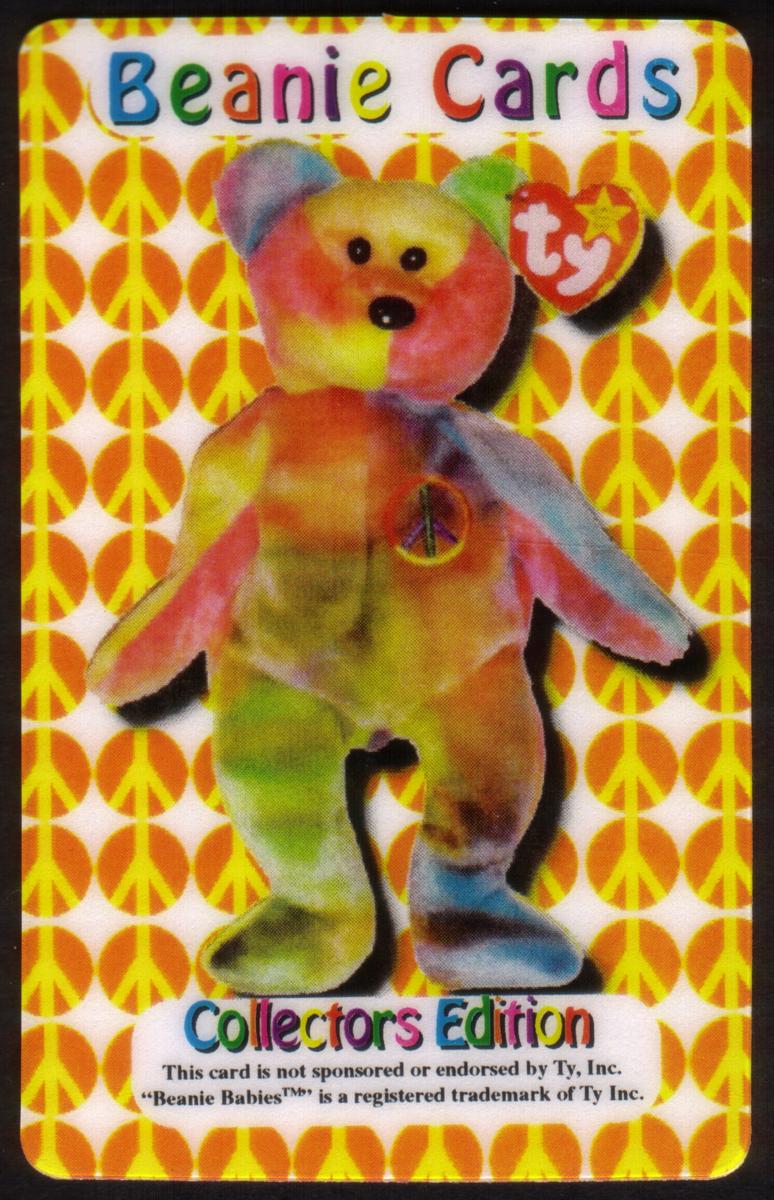 This collectible card prominently features a multicolored teddy bear named Peace, part of the Ty Beanie Babies collection. The bear is primarily designed with a colorful, tie-dye pattern that includes various shades blending across its plush body. Peace holds a white peace symbol in its left paw, clearly visible and central to the design, emphasizing the theme of peace and harmony associated with the character. The bear's face is embroidered with black eyes and a black nose, consistent with the typical Ty Beanie Babies style.
