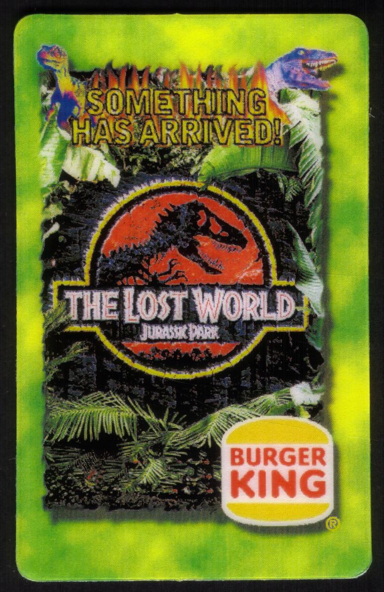 In the lower right corner, the Burger King logo is displayed clearly, confirming the card as part of a Burger King promotional series related to the movie. The bright green-bordered card further enhances the vibrant and adventurous feel connected to the Jurassic Park entertainment theme. The card is associated with keywords including Burger King, movies, dinosaurs, and entertainment, specifically linking to the Jurassic Park promotion.