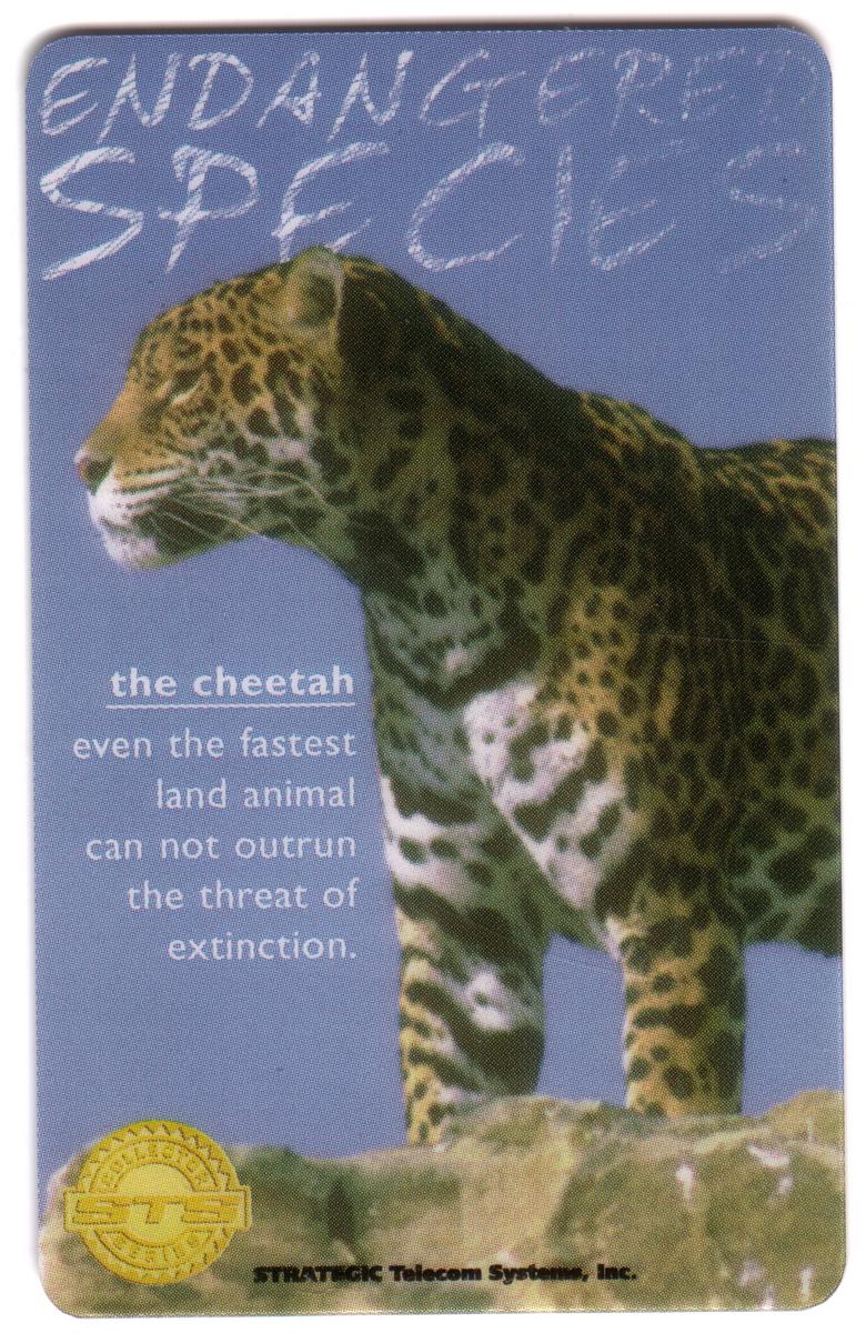 Designed as part of a series by Strategic Telecom Systems, the card integrates both wildlife imagery and conservation messaging. The overall presentation combines educational value with collectible appeal, focusing exclusively on the cheetah and its endangered status.