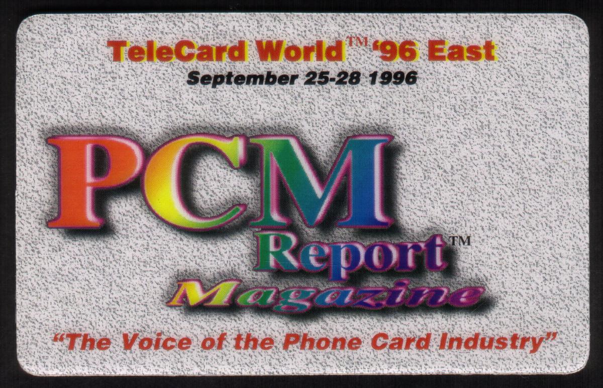 The card also references the "Phonecard Market Report 5m PCM Report Magazine (Telecard World '96 East) 09/96," specifying the date September 1996. Additionally, the name "Tell-One Inc." appears on the card, associating this company with the phone card promotion or production. The overall style is clean and business-oriented, reflecting its promotional purpose in relation to phone card industry trade publications and exhibitions.