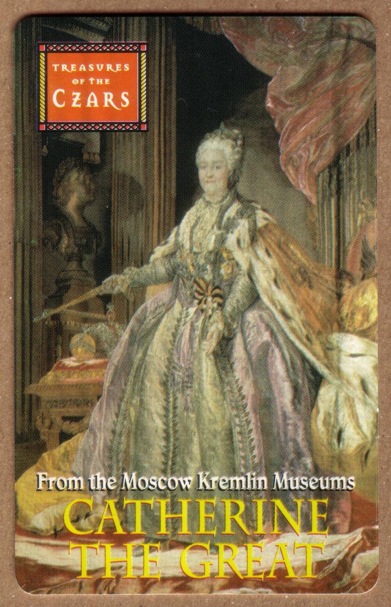 This collectible phone card features an image of Catherine the Great, one of the most prominent leaders of Russia. The design includes a portrait of Catherine the Great in regal attire, highlighting her status and historical significance as an imperial ruler. The card is associated with the Moscow Kremlin Museums, a renowned cultural landmark in Russia.