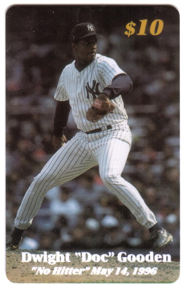This collectible telephone card features Dwight "Doc" Gooden, a prominent Major League Baseball pitcher, in a pitching stance wearing the New York Yankees uniform. The foreground image captures Gooden mid-delivery on the pitcher's mound, dressed in the classic pinstriped Yankees jersey and cap, emphasizing his role in Major League Baseball. The card commemorates his "No Hitter" game on May 14, 1996, a significant achievement in his baseball career.