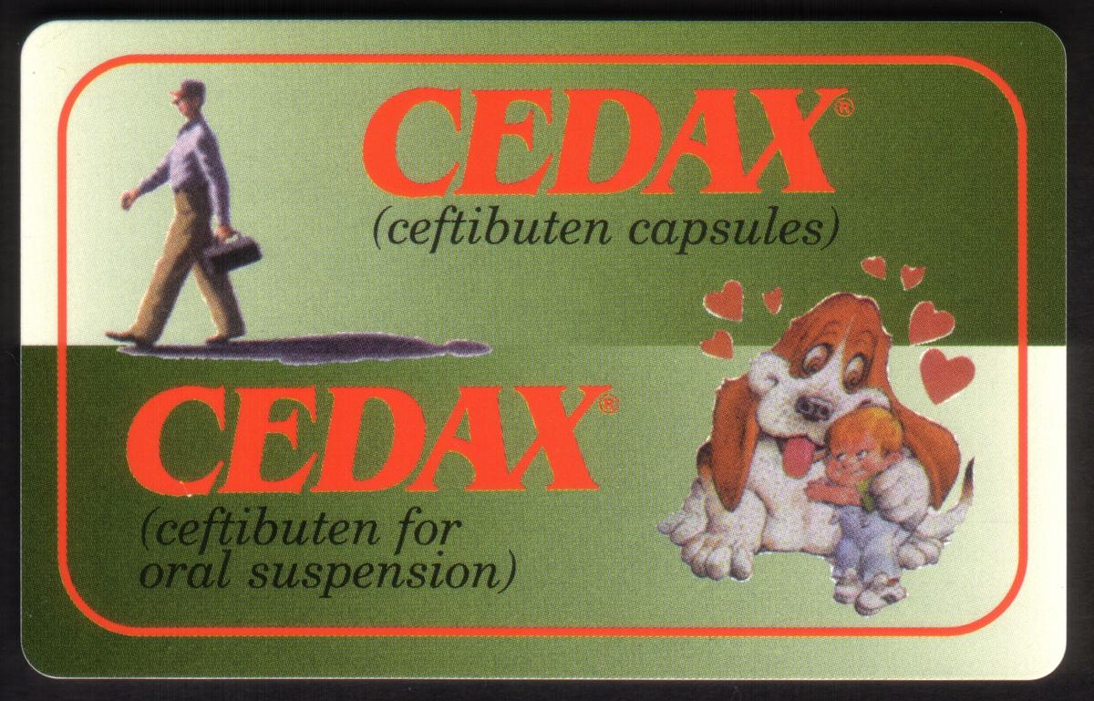 This telephone card clearly promotes Cedax medication, emphasizing both its capsule and oral suspension forms. The combination of the professional figure on the left and the warm, friendly dog-and-child illustration on the right conveys themes of health, care, and trust.