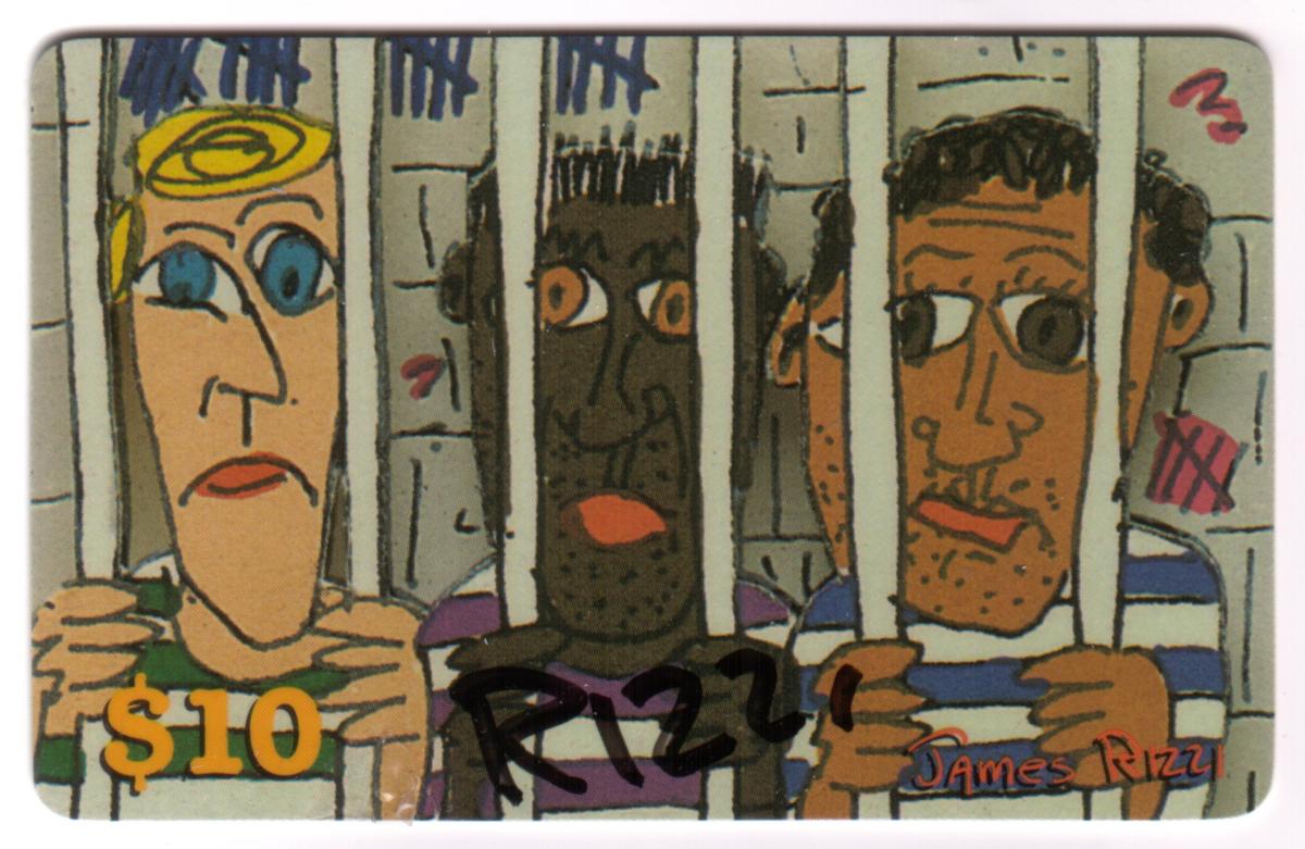 This collectible card features artwork by James Rizzi, known for his vibrant, cartoon-style paintings. The design showcases an intricate urban scene that includes various elements such as jail cells with prison bars, figures representing criminals, and street walkers or prostitutes. The composition uses watercolor techniques with bold outlines and bright colors, typical of Rizzi's distinctive style.