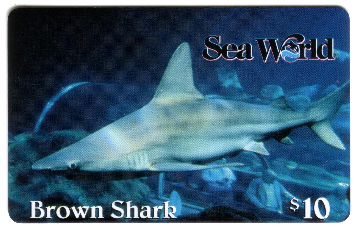 Text on the card also includes the words "sharks" and "fish," reinforcing the marine theme. The card’s presentation and branding connect it to Sea World, a notable marine park known for animal exhibits and conservation efforts. The card combines collectible value with visually striking marine imagery centered on the Brown Shark and its aquatic surroundings.