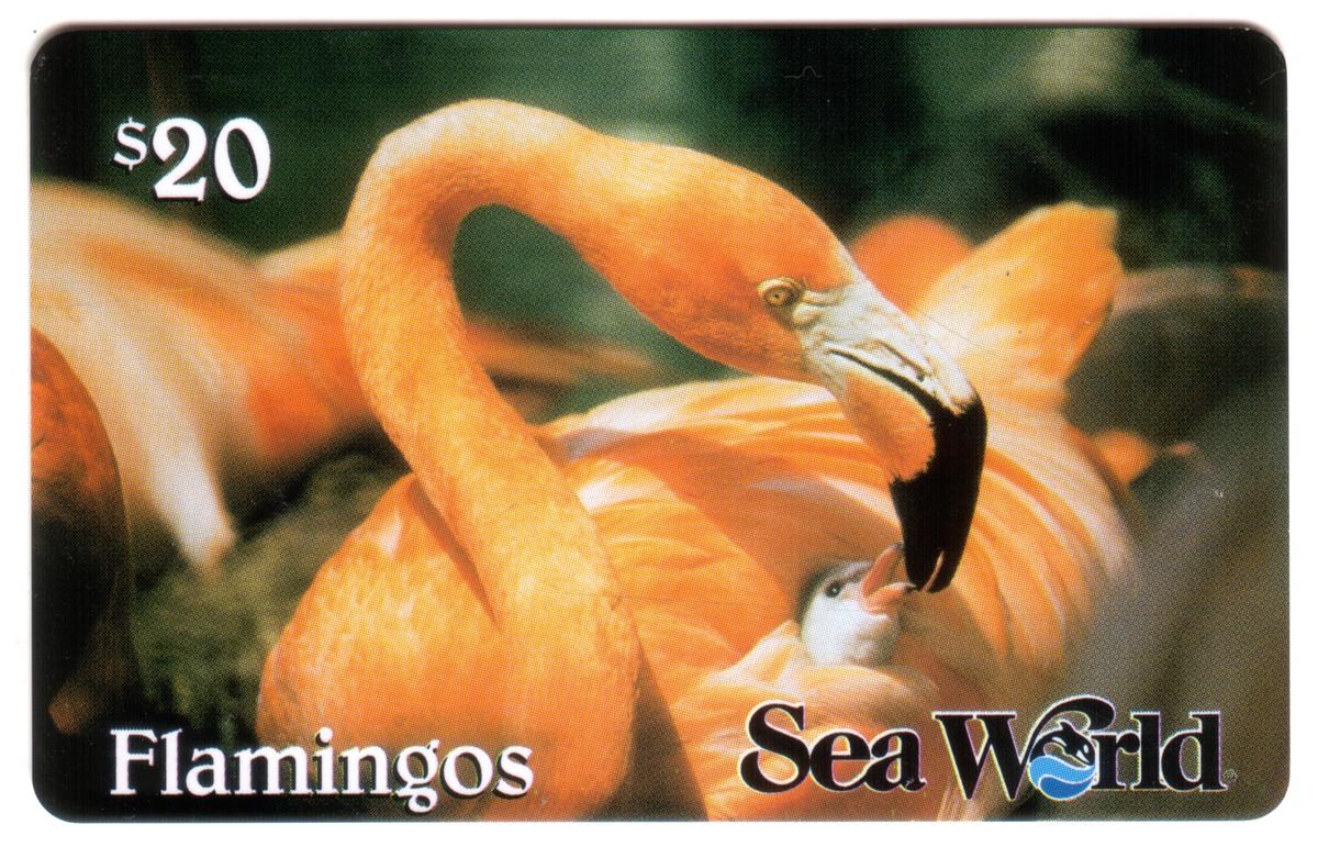 This collectible phone card features a vibrant depiction of flamingos, prominently showcasing their bright pink plumage. The scene is set at SeaWorld, specifically under the theme "Flamingos - North American Tel." The card’s value is clearly indicated as $20, printed on the front. The design captures the elegance and distinctive coloration of the flamingos, emphasizing their natural beauty.