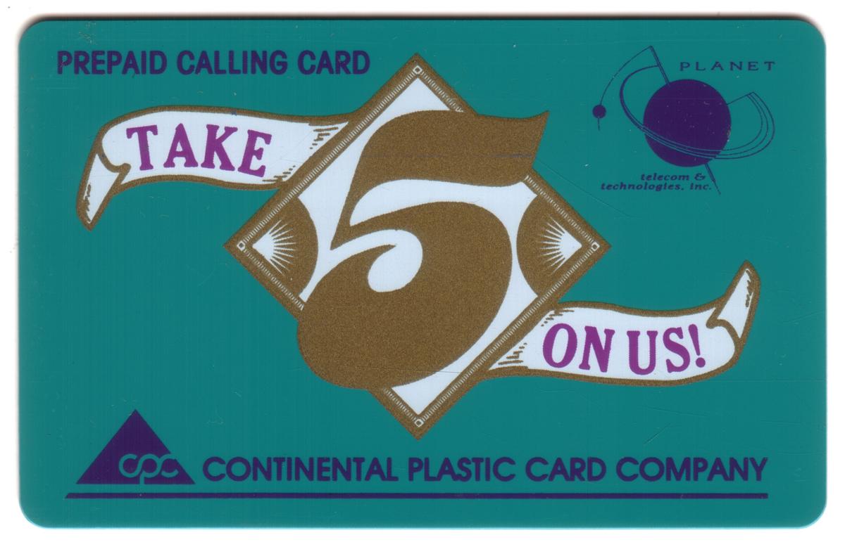 Text on the card identifies it as issued through Planet Telecom (MMC), making it clear that the card is related to their telecommunication services. The card is promotional in nature, as indicated by the “Take 5 On Us!” statement, which likely refers to a complimentary or bonus calling time offer. The inclusion of both manufacturing companies’ names—Continental Plastic Card Company and Continental Plastics—underscores the professional production quality of this collectible phone card.