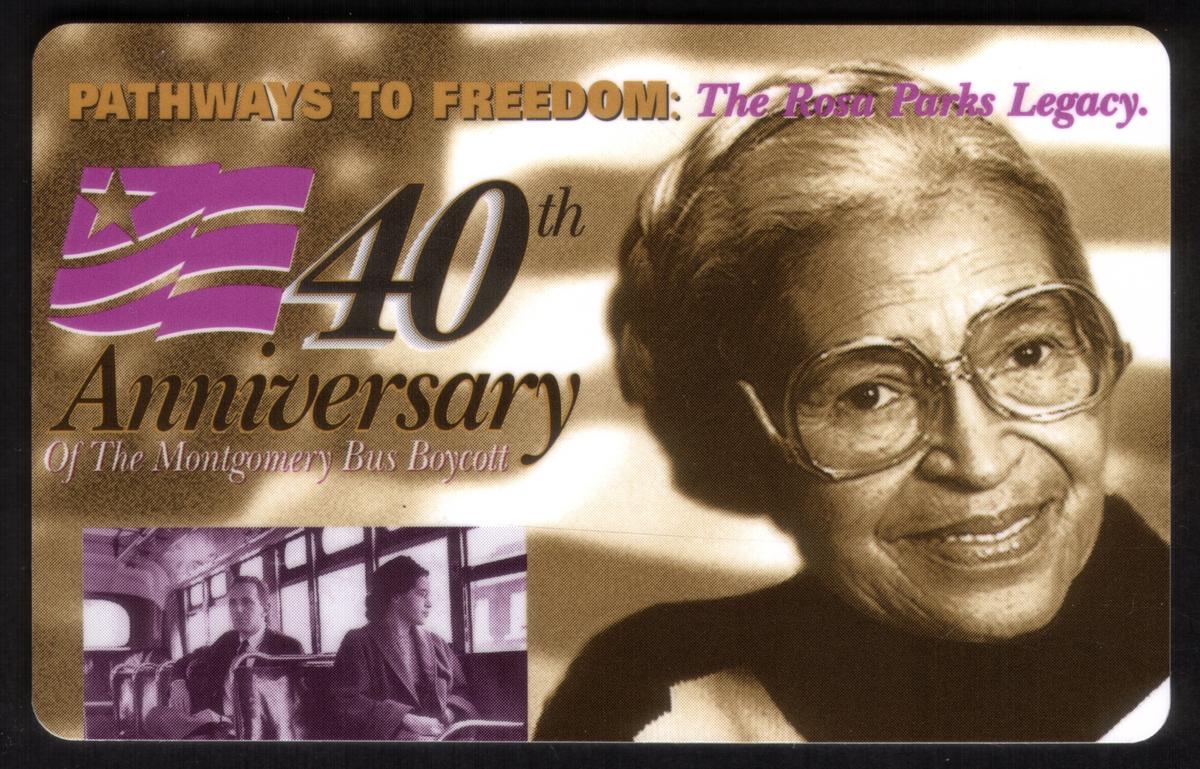This collectible phone card commemorates the 40th Anniversary of the Montgomery Bus Boycott, highlighting "Pathways to Freedom: The Rosa Parks Legacy." It features a large photographic portrait of Rosa Parks wearing glasses, smiling gently. To the left, there is a smaller black-and-white image depicting Rosa Parks on a bus, seated and facing forward, accompanied by another passenger.