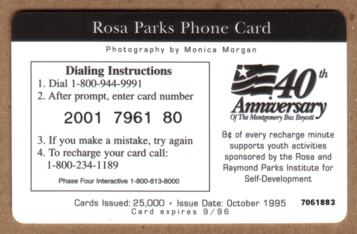 Photographer Monica Morgan and the Rosa and Raymond Parks Institute for Self Development are credited as part of this Phase Four Interactive Telecom release. The card marks a significant civil rights milestone, supporting awareness and preservation of Rosa Parks' legacy through this promotional collectible.