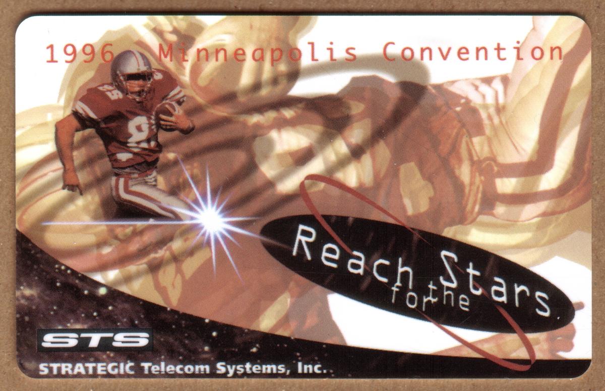 Minneapolis, Minnesota, the location of the convention, is mentioned to establish the setting and significance of this collectible item. The phone card celebrates the theme of journeying with Strategic Telecom Systems Inc. during the 1996 convention, marking a connection between technology, sports, and promotional efforts in the telecom field. The visual and textual elements combine to create a vivid representation of football culture and the technological aspirations of the era.
