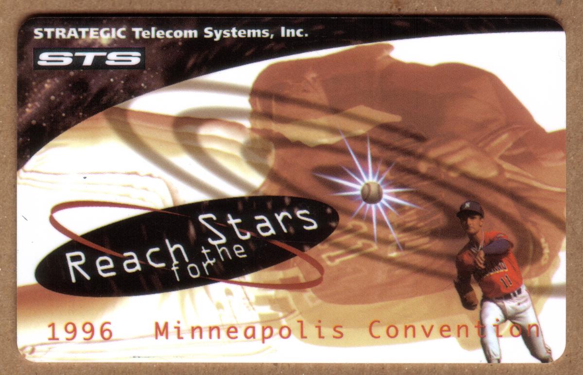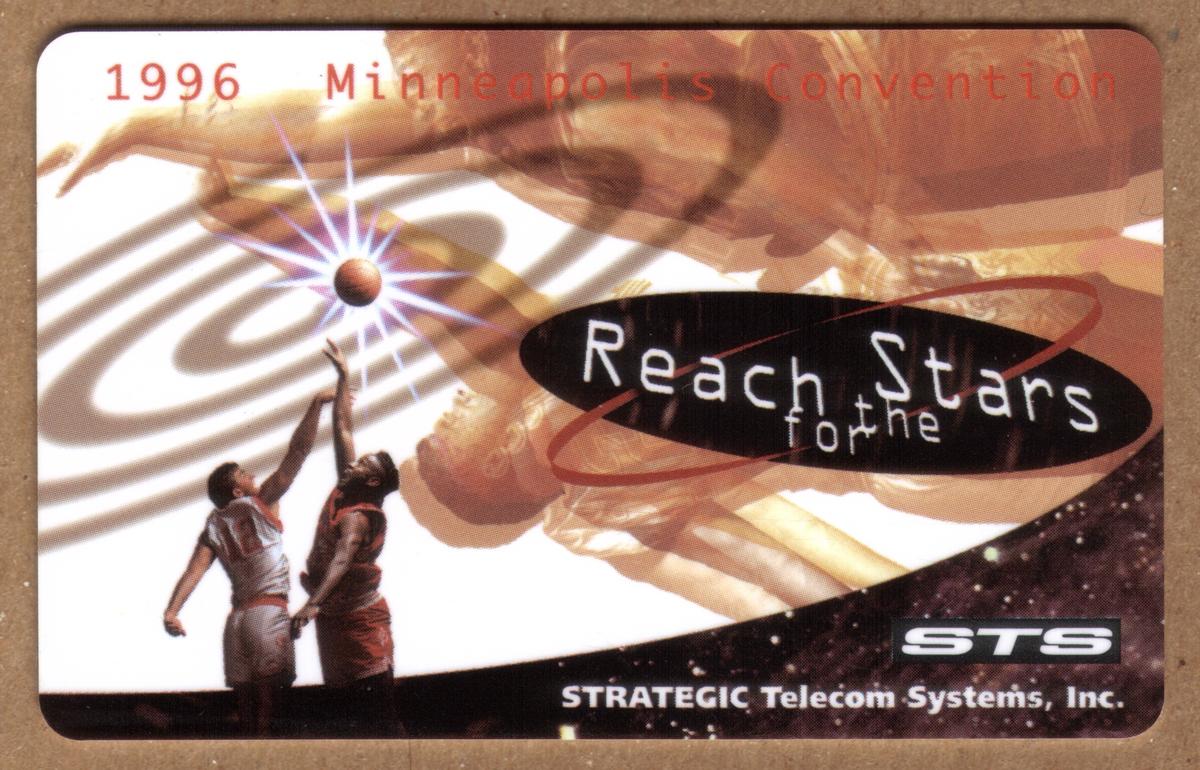 These three collectible phone cards are part of the "Reach For The Stars" set from the 1996 Minneapolis Convention, produced by Strategic Telecom Systems, Inc. (STS). Each card prominently features the text "Reach for the Stars" inside an elliptical black shape with a red orbiting ring, along with the "STS" logo and full company name "Strategic Telecom Systems, Inc." printed on them. The event "1996 Minneapolis Convention" is clearly indicated in red text across the cards.