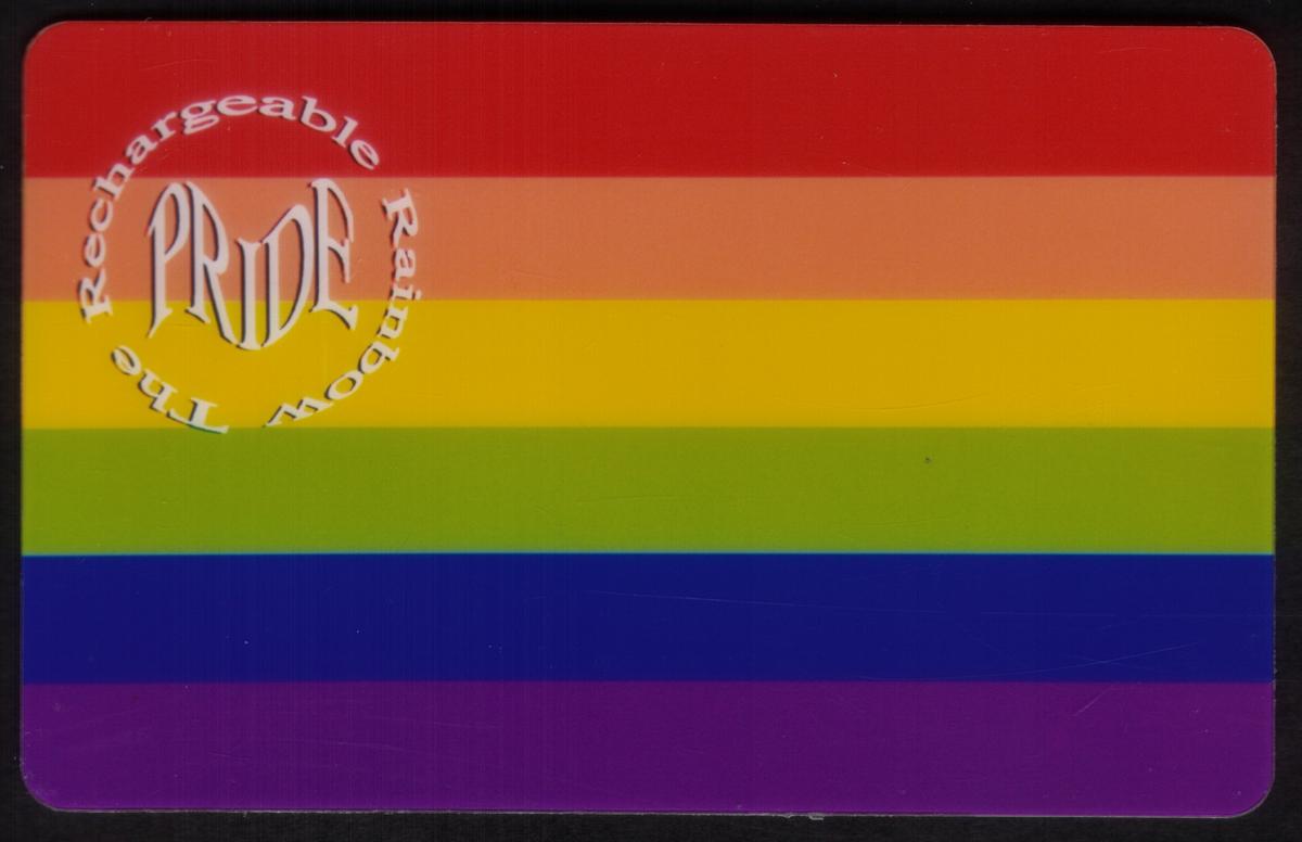 The card’s design emphasizes the symbolism of the LGBTQ community through the vivid rainbow stripes, representing diversity and inclusion. The minimalistic presentation focuses entirely on the pride flag colors and the text elements, with no additional images or logos on the front face. The card’s rectangular shape and vibrant color scheme make it a standout collectible reflecting LGBTQ artistic themes.