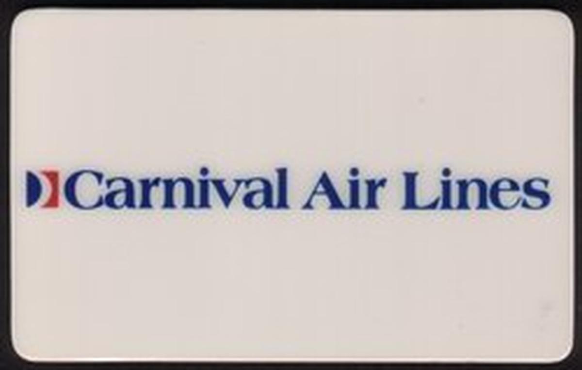 This collectible phone card features promotional logos and trademarks related to aviation. The card prominently displays the Carnival Air Lines logo in a stylized font with bold colors. Adjacent to this, the LDDS WorldCom logo is shown, featuring the WorldCom name in a distinct typeface. Both logos are clearly printed on the card front, emphasizing corporate branding associated with telecommunications and airline services.