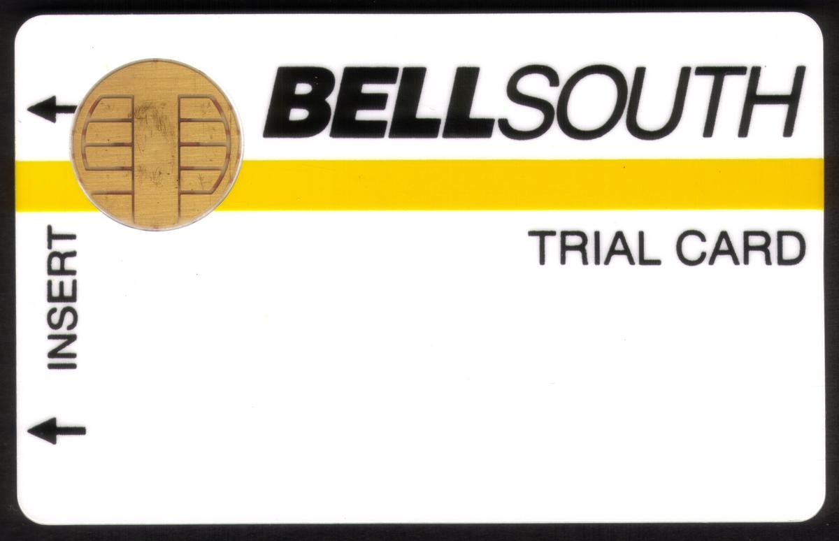 This card is identified as a First Test / Trial Card with Bull Chip and Magnetic Stripe from 1989 (Type 2) associated with BellSouth Telecom. It is a collectible corporate service chip card used to test or trial BellSouth's telecommunications services. The card’s design is minimalistic, focusing on the corporate branding and trial function without additional logos or imagery.
