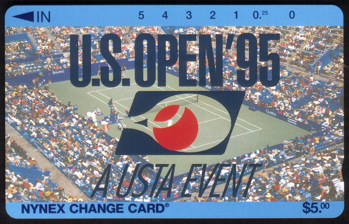 This card is a collectible NYNEX Change Card featuring the 1995 U.S. Open Tennis Tournament. The front displays an aerial photograph of a tennis match in progress on a hardcourt stadium filled with many spectators, capturing the vibrant atmosphere of the event held in New York, NY. Centered on the card is the bold text "U.S. OPEN '95" above the official United States Tennis Association (USTA) logo, which consists of a stylized tennis ball and racket graphic. Below the logo, the phrase "A USTA EVENT" is printed, indicating the tournament's official sanction.