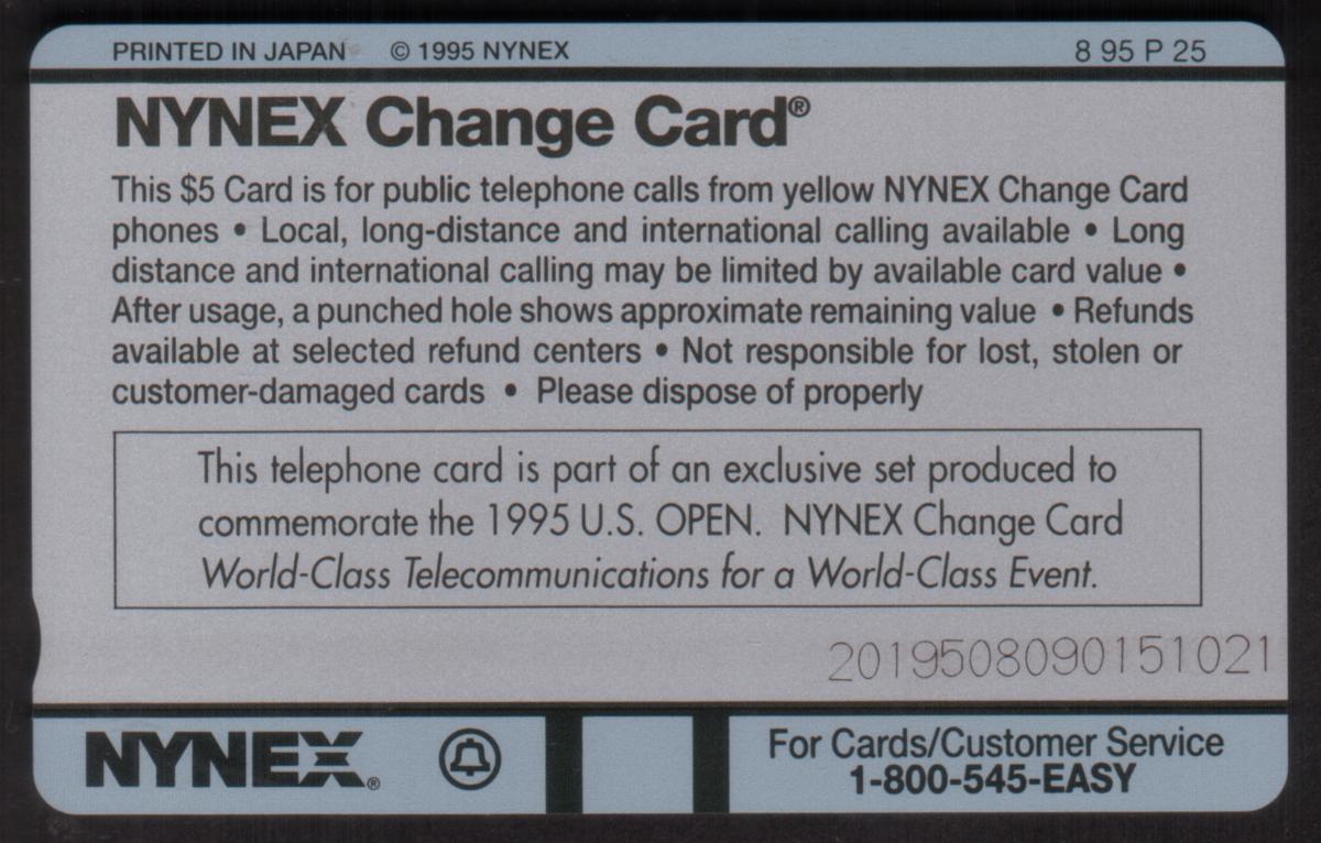 The card has a blue top and bottom border that contains functional call indicators and text. The top border includes a numeric scale from 0 to 5 with the label "IN" positioned on the far left. The bottom border highlights the "NYNEX CHANGE CARD®" branding and denotes a value of "$5.00" in the lower right corner. The card is associated with the U.S. Open tennis championships, a prominent sports event organized by the United States Tennis Association and sponsored by NYNEX, a telecommunications company.