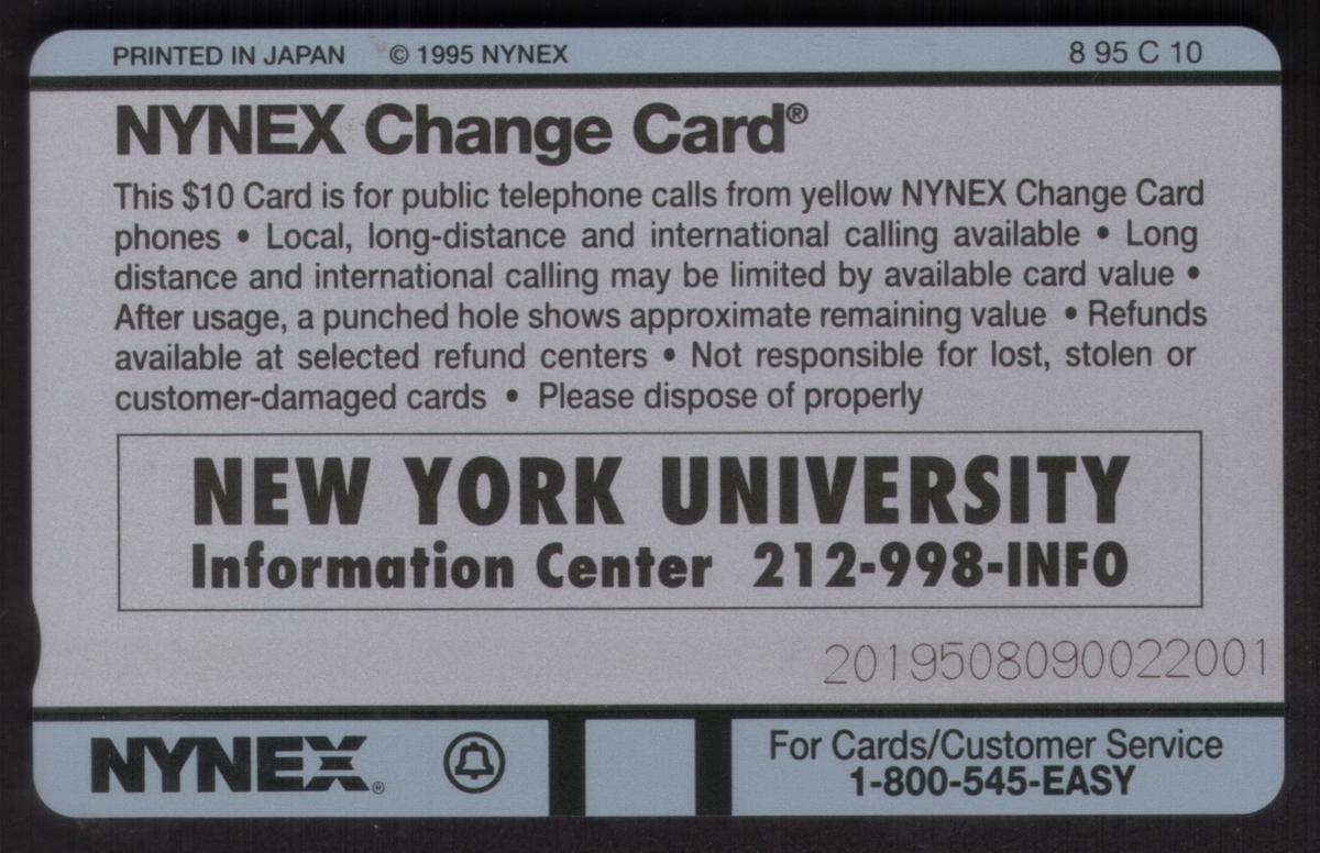 At the bottom of the card, the text "NYNEX CHANGE CARD®" is printed in black on a white background. The card’s value is indicated as "$10.00" on the right side next to the NYNEX branding, associating this card with the NYNEX telephone service. The overall design uses sharp contrasts and clean lines to emphasize the connection to New York University and its mascot, the bobcat.