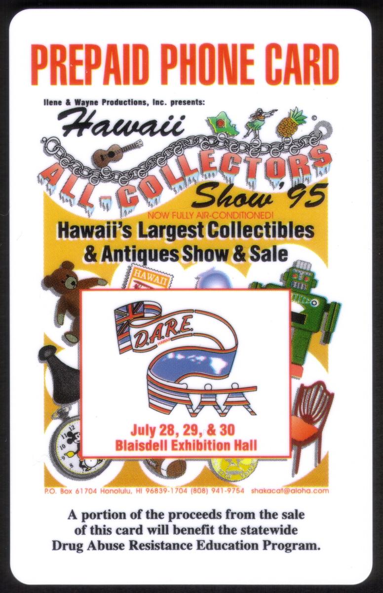 This prepaid phone card features promotional artwork for the Hawaii All Collectors Show '95. The card prominently displays the event title with bold red and black typography, highlighting "Hawaii's Largest Collectibles & Antiques Show & Sale." The show dates are July 28, 29, and 30, and the venue is Blaisdell Exhibition Hall in Honolulu, Hawaii. The artwork includes colorful illustrations surrounding the central information, such as a teddy bear, a pineapple, a robot, a clock, and a chair.
