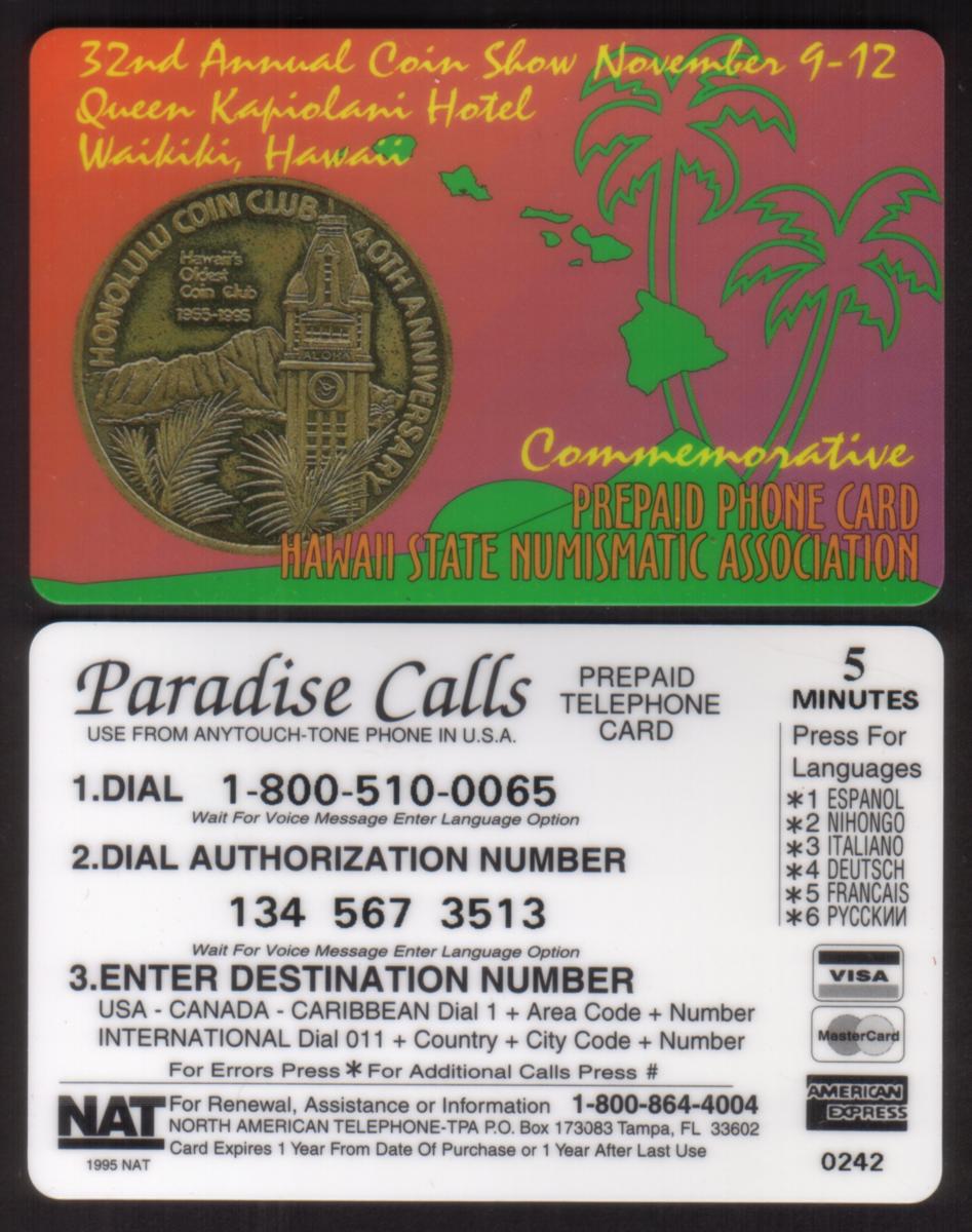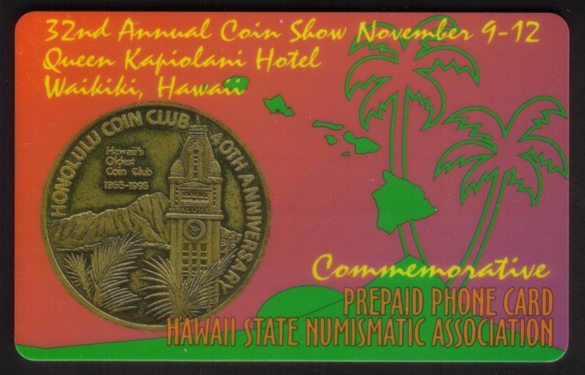 This collectible prepaid phone card serves as a tribute to Hawaii’s oldest coin club and the 32nd Annual Coin Show, emphasizing the state's rich numismatic history and its celebration at the renowned Queen Kapiolani Hotel.