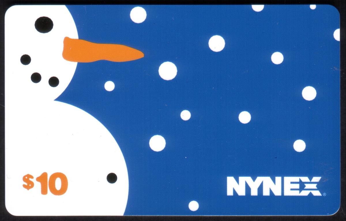 Overall, this phone card captures the spirit of Christmas with its snow-covered setting, festive colors, and playful snowman character. It represents a collectible item issued by NYNEX New York Telephone, intended for use during the holiday season.