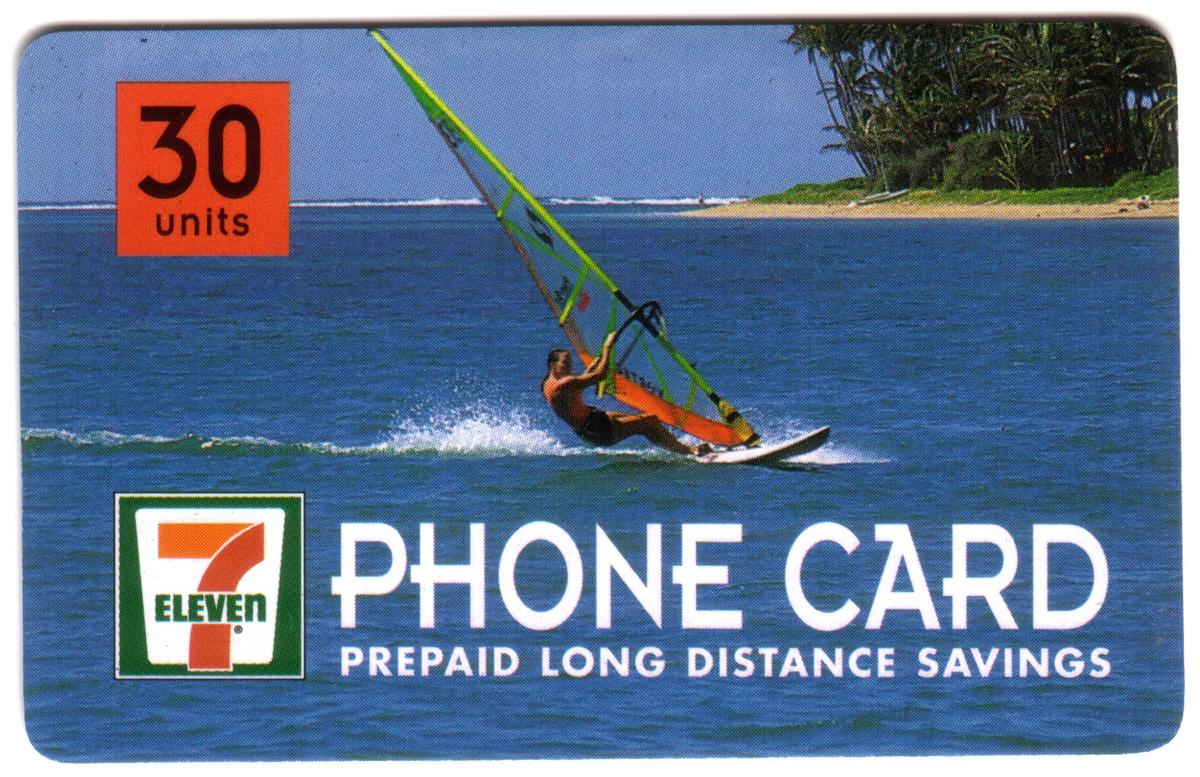 This collectible phone card features vibrant and dynamic imagery related to windsurfing in Hawaii, prominently displaying the name Karen Lattanzi. The card is branded with the 7-Eleven logo, presented as “7-11,” “7/11,” “seven-eleven,” “seven eleven,” and “seven-11,” indicating its association with the convenience store chain’s collectible series. The design showcases a windsurfing scene, emphasizing the energetic and adventurous spirit of the sport.
