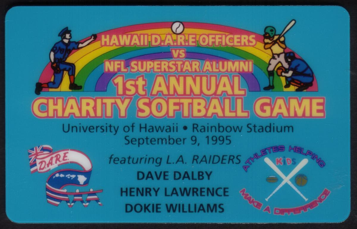 This collectible card features the promotional artwork for the 1st Annual Charity Softball Game held in September 1995 at the University of Hawaii’s Rainbow Stadium. The event showcased a matchup between Hawaii D.A.R.E. officers and NFL Superstars alumni, involving notable players from the L.A. Raiders such as Dave Dalby, Henry Lawrence, and Dokie Williams. The card highlights the collaboration of athletes helping kids make a difference, emphasizing the charitable and community support goals behind the event.