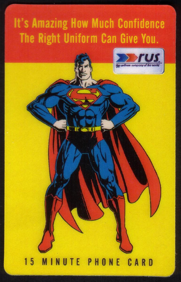 Text on the card includes “15m” indicating its value or unit, along with the label “Superman Super Hero: RUS.” The card is issued by The Uniform Company of The World and Innovative Telecom, companies associated with telecommunications. The composition and design emphasize Superman as the focal character, showing a modern and polished style consistent with DC Comics branding.