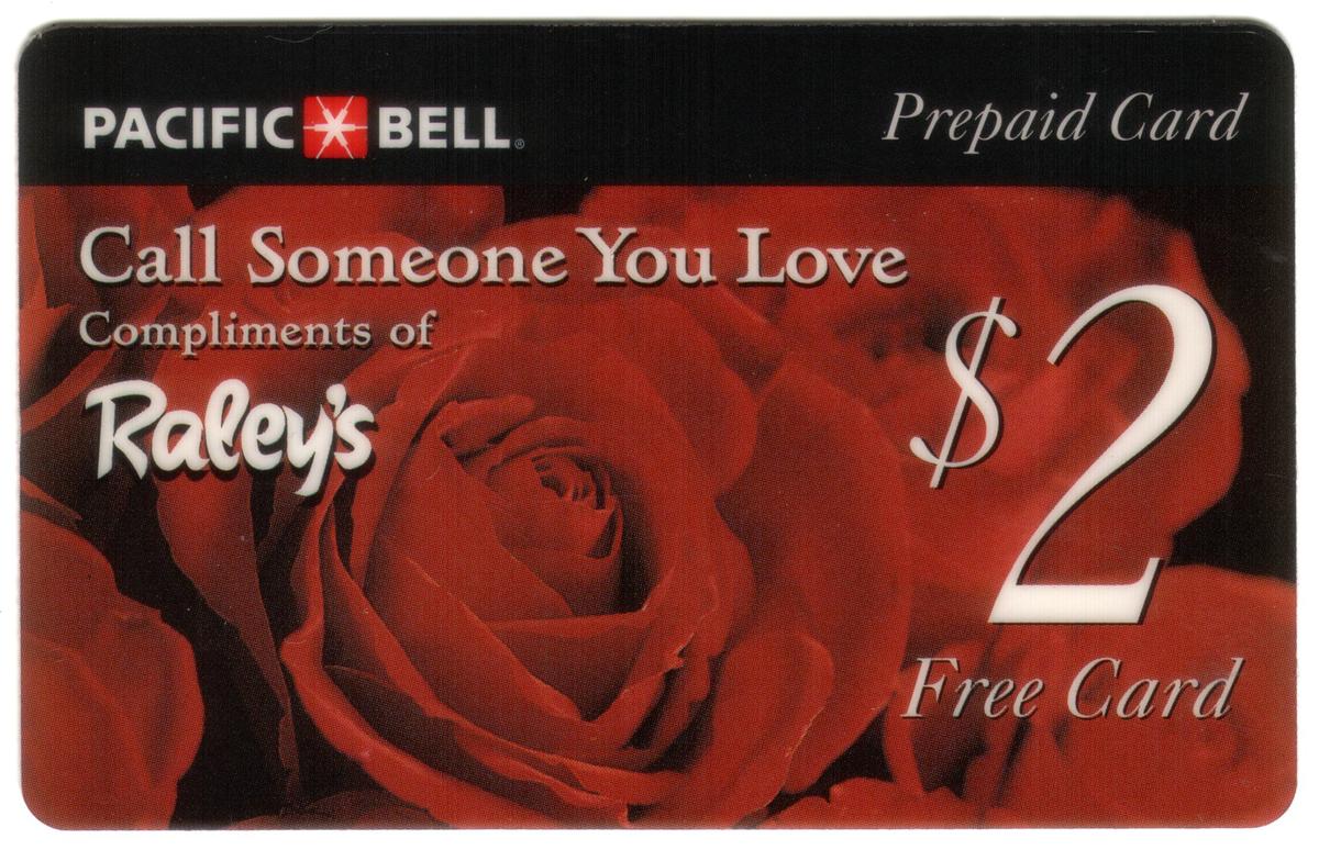 The card is branded with the Pacific Bell logo, indicating its association with the telecommunications company. It also includes the text "Compliments of Raley’s," signifying that it was distributed by Raley’s grocery stores as part of a special holiday promotion. The denomination on the card reads "$2," marking its value for use.