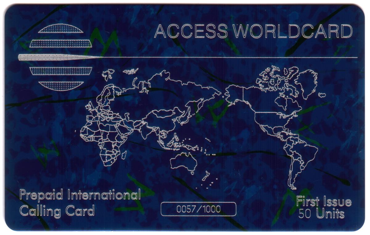 This card serves as a collectible item from Access Telecom, focusing on global connectivity themes as represented by the world map motif. The clean layout of the card emphasizes its hand-painted aluminum construction and the distinct blue base, making it a notable piece for collectors interested in telecommunication memorabilia or map-themed phone cards.