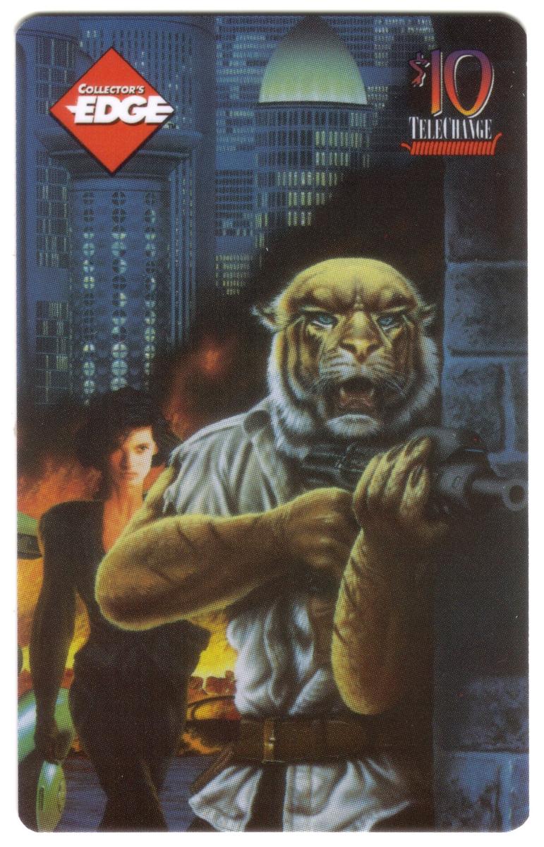 The textual content on the card includes "animation," "art - cartoons," "cartoon characters," "art - fantasy," "comic strips," and "super heroes," which align with the visual presentation on the card’s front. The card’s layout includes a clean arrangement of these thematic keywords alongside the graphic, making it a notable piece for collectors interested in fantasy art and telecommunication collectibles.