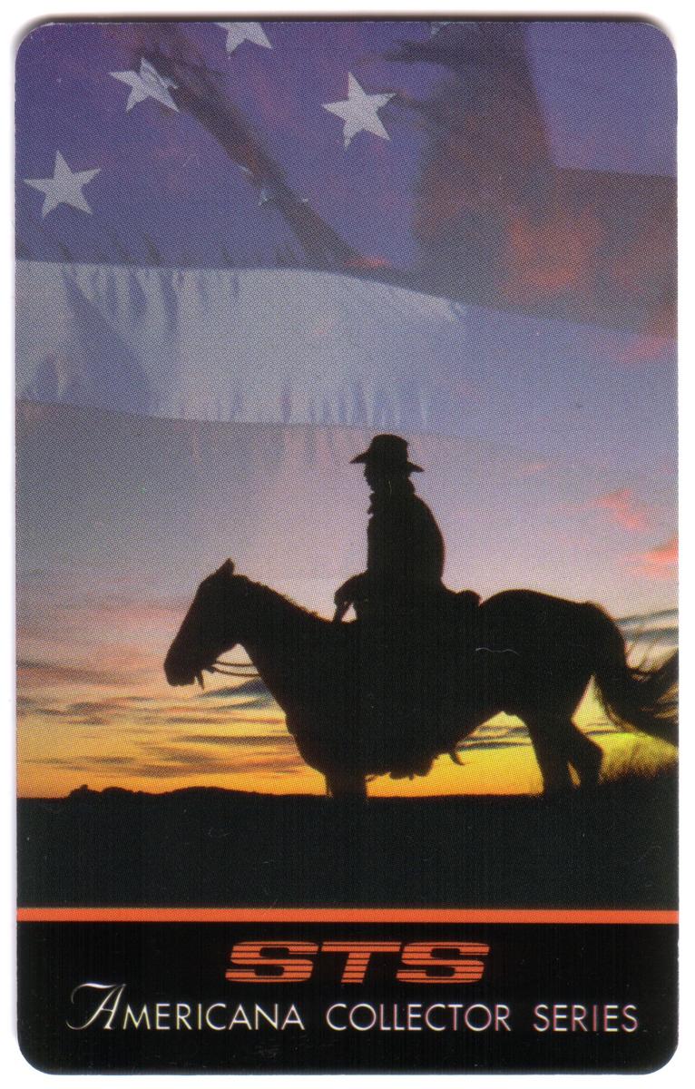 The card includes clear branding from Zenex, the issuing company, positioned on the front. Above the image, the text “STRATEGIC TELECOM SYS.” appears, indicating the service or system associated with this card. Additionally, the card includes the word “ANIMALS,” connecting the cowboy and horse to the theme of animals within the Americana series. The entire design captures a moment of western Americana culture with emphasis on the iconic symbol of the lone cowboy and the American flag.